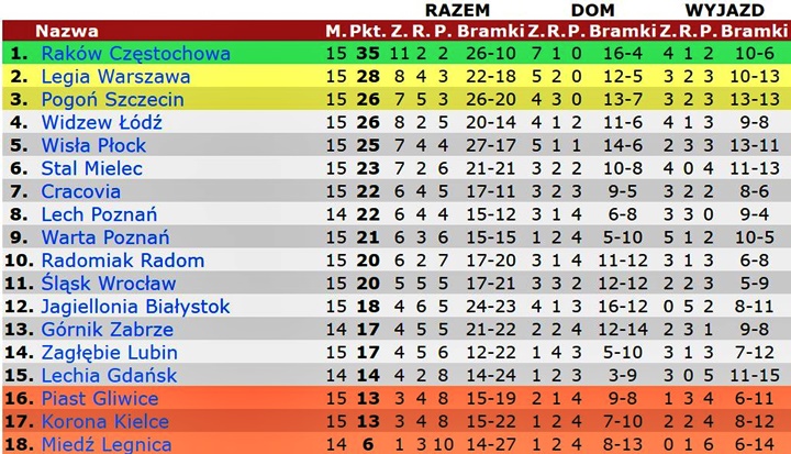 Po 15. kolejce PKO Ekstraklasa