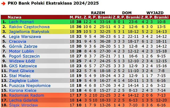 Po 18. kolejce PKO Ekstraklasa